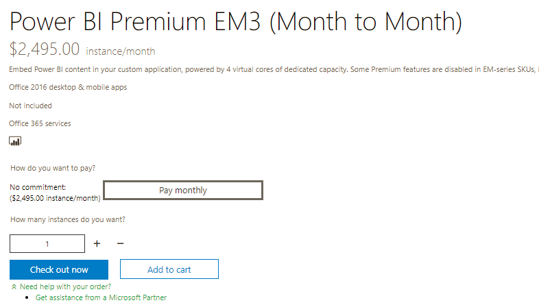 Các node trên được xây dựng từ thấp đến cao, trong này có thêm gói EM3 (month to month) -> node này chủ yếu phục vụ cho mục đích triển khai embed apps. Việc mua các gói này cũng rất đơn giản, bạn có thể mua trực tiếp trên trang Power BI hoặc thông qua các đại lý tại Việt Nam.
