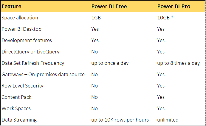 – Capacity: với bản free chúng ta chỉ có 1GB cho khu vực lưu trữ, trong khi bản Pro là 10GB. Các bạn sẽ có câu hỏi: “Sao ít thế, ngay cả bản Pro 10GB cũng không đủ để lưu trữ báo cáo của tôi?!” dataMAKER sẽ có bài phân tích về cách thức lưu dữ liệu & kỹ thuật nén dữ liệu của Power BI ở bài sau sẽ giúp bạn giải quyết thắc mắc trên.