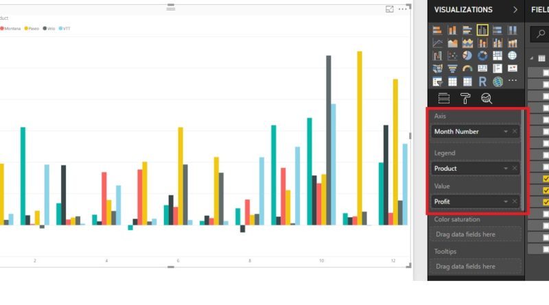 Tại mục Fields, ta lần lượt chọn Axis là Month Number, Legend là Product và Value là Profit. PowerBI sẽ tạo ra một biểu đồ tương ứng.