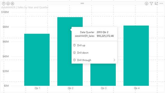 Thường khi muốn Drill-down, Drill-up, Drill Through, click chuột phải lên cột giá trị trong chart muốn thực thi và chọn Drill-down, Drill-up, Drill Through.