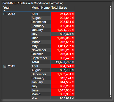 Total Sales with CF = var _kpi = 900000 return IF([Total Sales] > _kpi, "#FF0000")