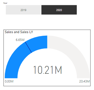 Kết quả của Gauge Chart được tạo như hình bên dưới. Năm được chọn đo lường là năm 2020, với target là giá trị năm 2019, ta thấy giá trị năm 2020 đã vượt mục tiêu đề ra.