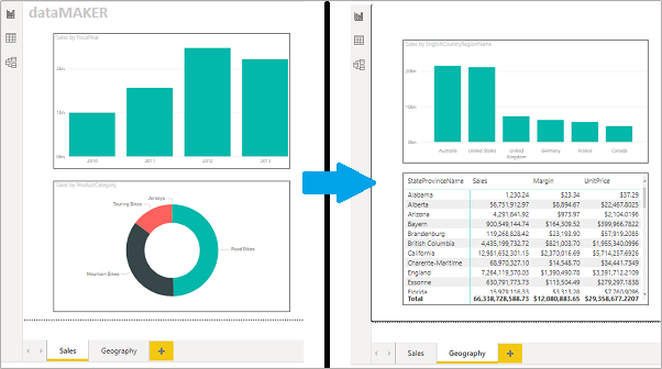 DataMAKER có 2 trang báo cáo với tên Sales và Geography, dataMAKER muốn sử dụng tính năng Page Navigation để điều hướng qua lại giữa 2 trang này.
