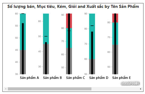 Hình bên dưới hiển thị biểu đồ Bullet Chart đã được tạo, trong đó màu xám thể hiện hiệu suất kém, màu xanh thể hiện hiệu suất tốt và màu đỏ thể hiện hiệu suất xuất sắc. Nhìn vào biểu đồ ta thấy sản phẩm A, sản phẩm B, sản phẩm D chưa đạt mục tiêu đề ra.